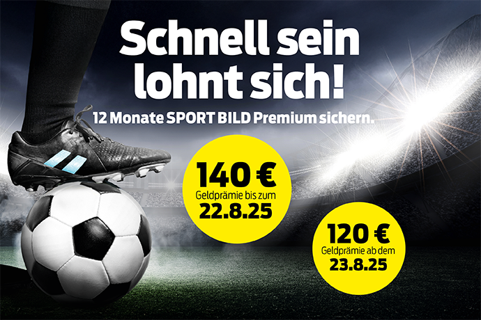 Wer bis zum 22. August ein SPORT BILD-Abo abschließt, bekommt 140 € als Prämie, danach 120 €!